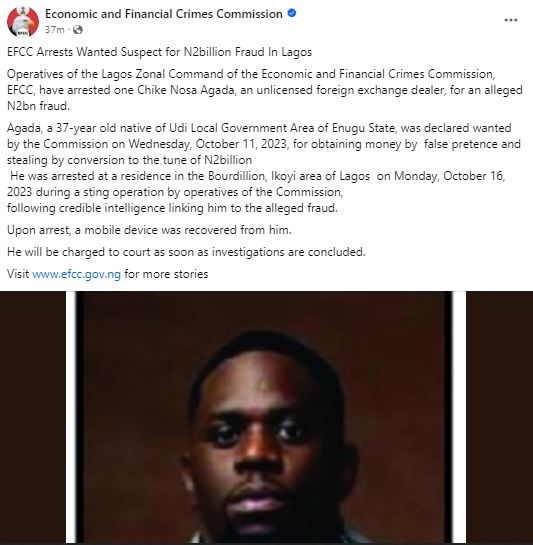 A statement released by the EFCC says Agada, a native of Udi Local Government Area of Enugu State, was declared wanted by the Commission on Wednesday, October 11, 2023, for obtaining money by false pretence and stealing by conversion to the tune of N2billion.
