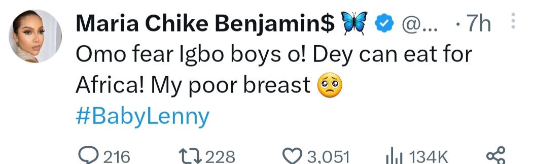 Updating her followers, she wrote on Twitter, "Omo fear Igbo boys o! Dey can eat for Africa! My poor breast. #BabyLenny."