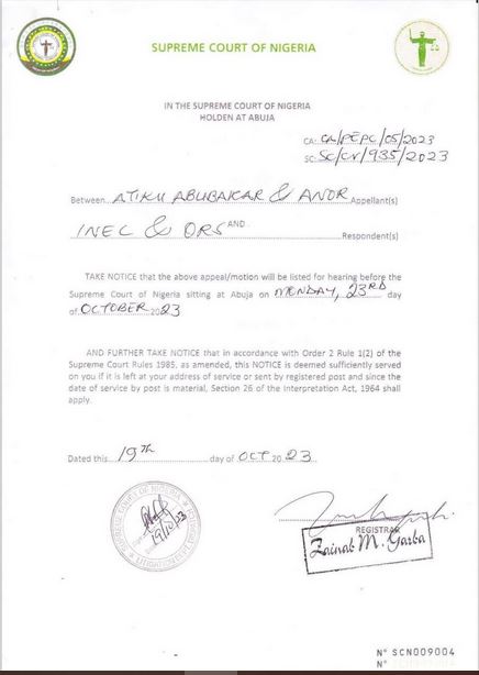 The Supreme Court of Nigeria has set a date to hear the appeal by the presidential candidate of the Peoples Democratic Party (PDP), Atiku Abubakar in the 2023 elections.