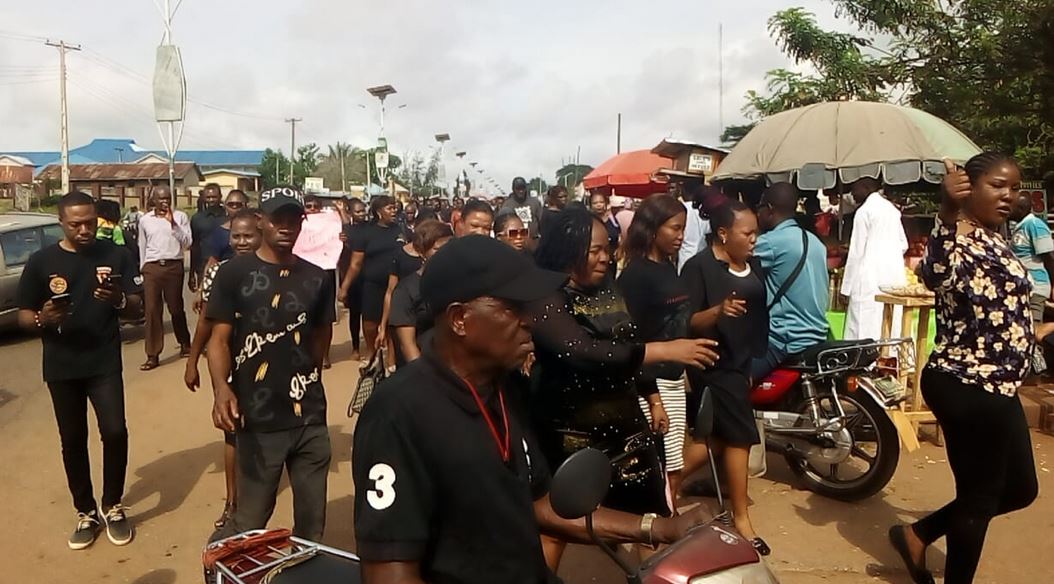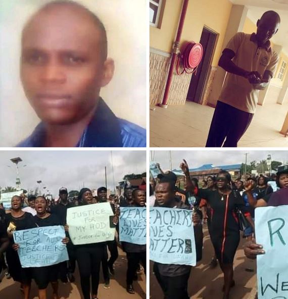 There was a protest staged by members of the Nigeria Union of Teachers, NUT, Ika South Local Government Area chapter in Delta State, led by her chairman, Comrade Isaac Arimokwu over the alleged killing of a Physics teacher in Alihame Mixed Secondary School, Agbo, Mr Onyeisi Sunday Ufah, by a parent.