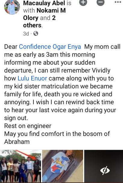 Confidence Ogar Enya, a fresh graduate of the University of Cross River State (UNICROSS), has reportedly died in a tragic accident two weeks after her final exams.