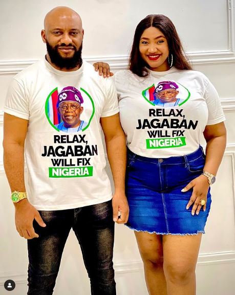 Sharing a photo of himself and his second wife, Judy Austin donning tee-shirts with the inscription, ‘Relax, Jagaban will fix Nigeria’, Yul Edochie wrote, “No matter the situation, no matter the struggles, all will be well with Nigeria.