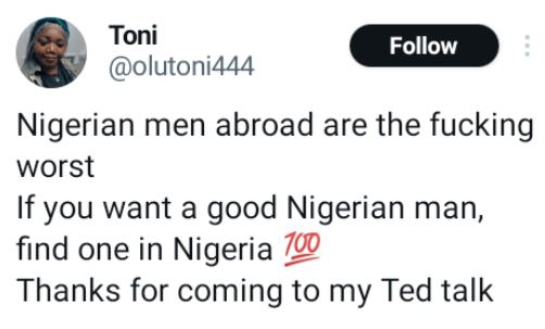 "Nigerian men abroad are the fucking worst. If you want a good Nigerian man, find one in Nigeria "Nigerian men abroad are the worst. If you want a good Nigerian man, find one in Nigeria - Canada based woman says Thanks for coming to my Ted talk," she wrote on Sunday, October 22.