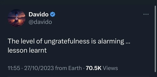 Nigerian singer, Davido has taken to Twitter now X to lament that people are ungrateful.