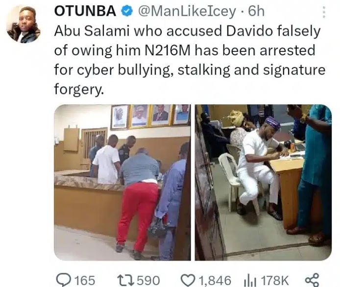 “Abu Salami who accused Davido falsely of owing him N216M has been arrested for cyber bullying, stalking and signature forgery.”