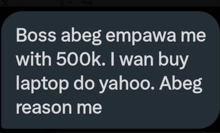 “Boss abeg empawa me with 500k. I wan buy laptop do yahoo. Abeg reason me,” the message read.