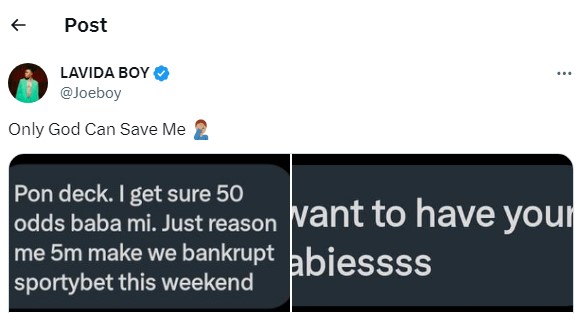 Reacting, Joeboy wrote; “Only God Can Save Me 🤦🏽♂️”