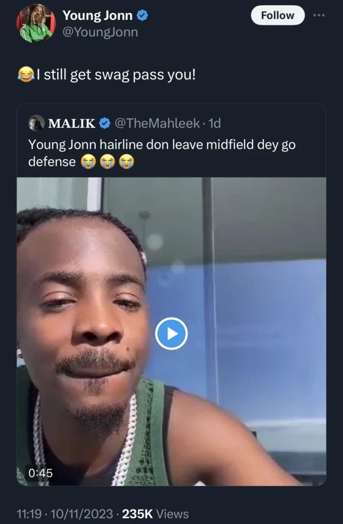 In a social media exchange, the fan had posted a video of the musician on his acoount, @TheMahleek, saying, “Young Jonn hairline don leave midfield dey go defense 😭😭😭”.