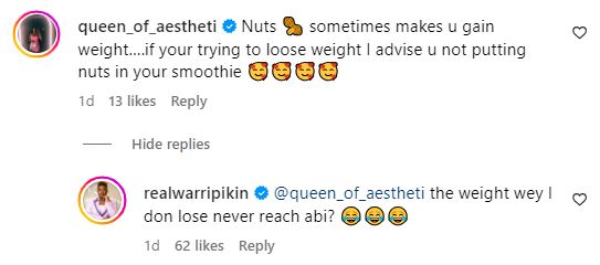 Comedienne, Realwarri Pikin has answered fans asking her to watch her weight.