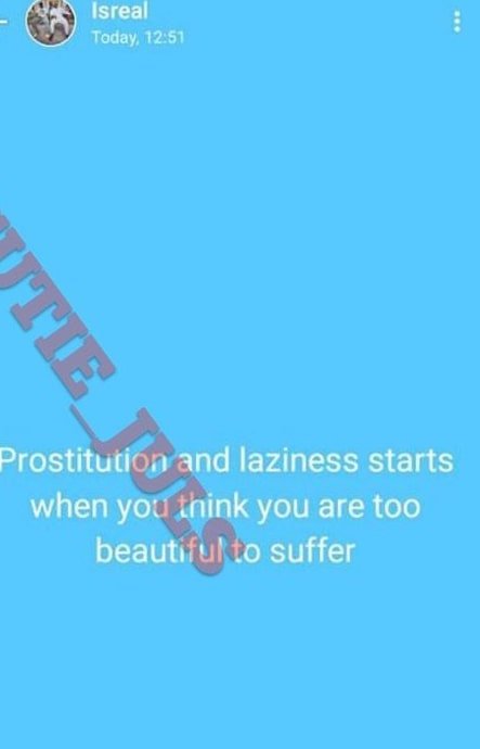 In the post, Isreal revealed how a woman becomes a prostitute or lazy person in a since-deleted Instagram post.