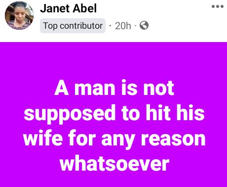 She stated this on Friday after one Janet Abel said men are not supposed to hit their wives for any reason whatsoever.