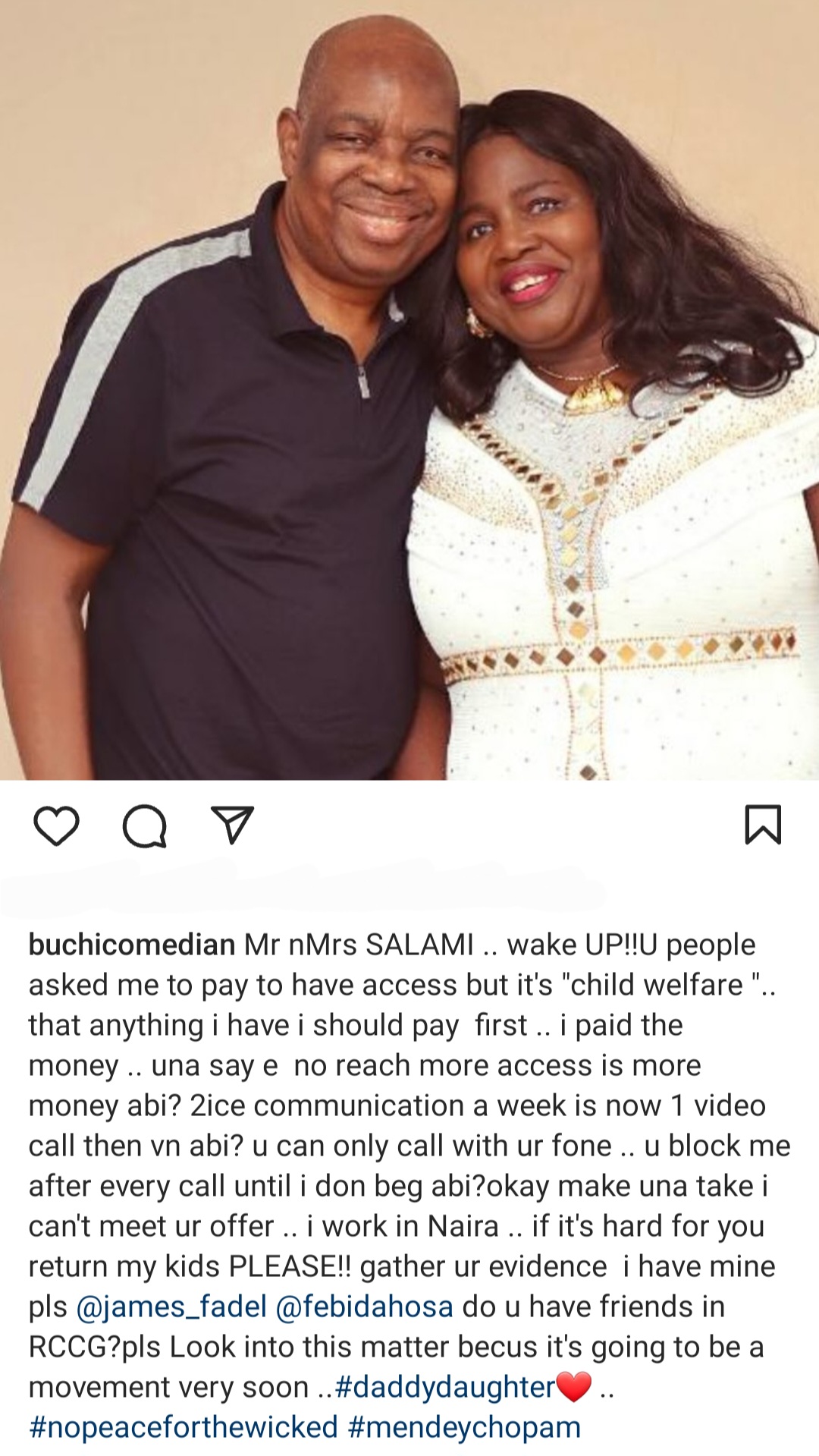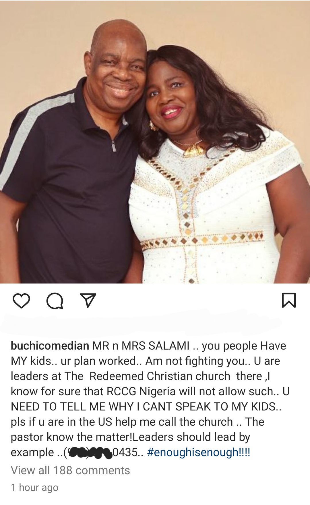 The comedian alleged that his ex-wife's parents, who are leaders in the Redeemed Christian Church of God, will not allow him to talk to his children.