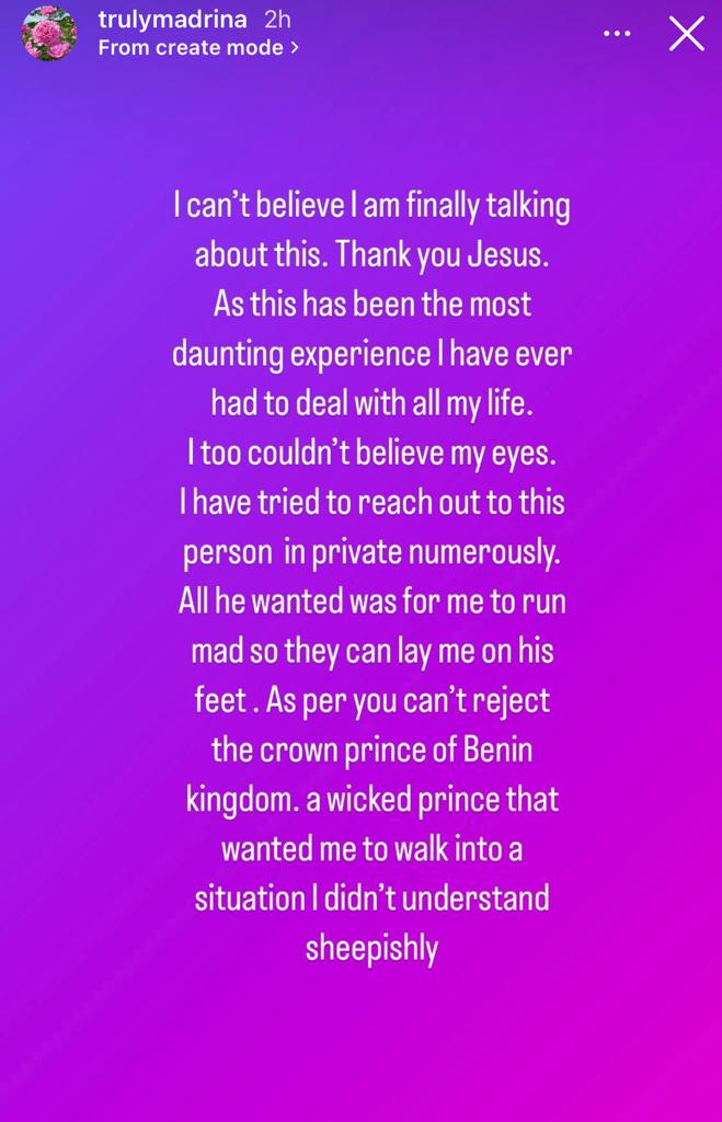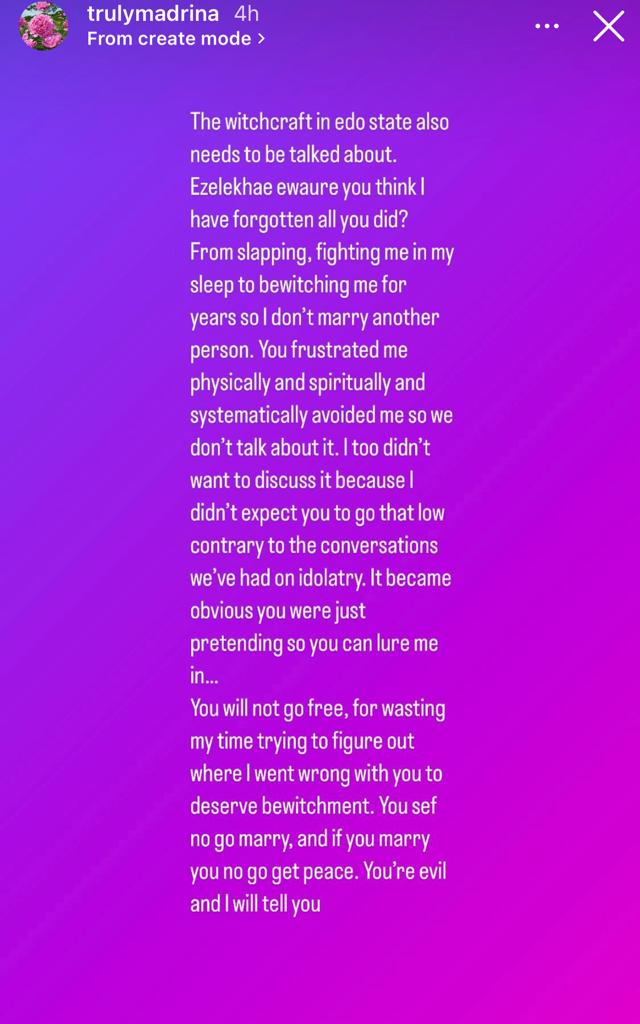 Cynthia stated this on her Instastories today November 19, while accusing an Edo crown prince of ‘bewitching’' her because she refused to marry him.