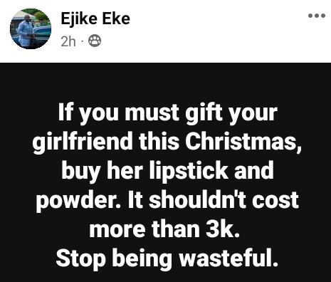 According to him, men should only buy only lipsticks and powders for their girlfriends not more than 3k as Christmas gifts.