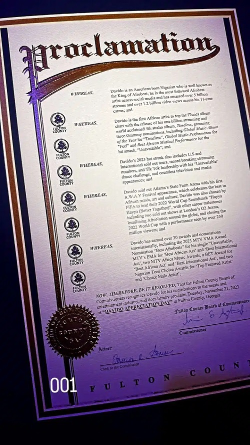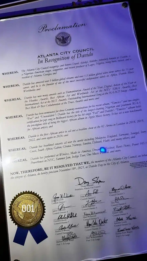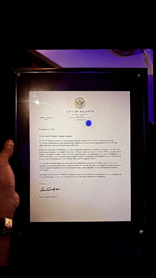 Nigerian singer, Davido has been honoured in Atlanta, Georgia, United States.