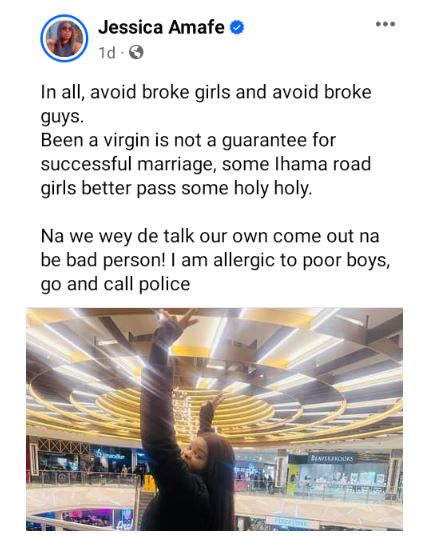 “In all, avoid broke girls and avoid broke guys. Been a virgin is not a guarantee for successful marriage, some Ihama road girls better pass some holy holy. Na we wey de talk our own come out na be bad person! I am allergic to poor boys, go and call police. ”