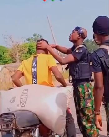 A video has surfaced online showing a Nigerian soldier cutting the hair of a civilian with scissors.