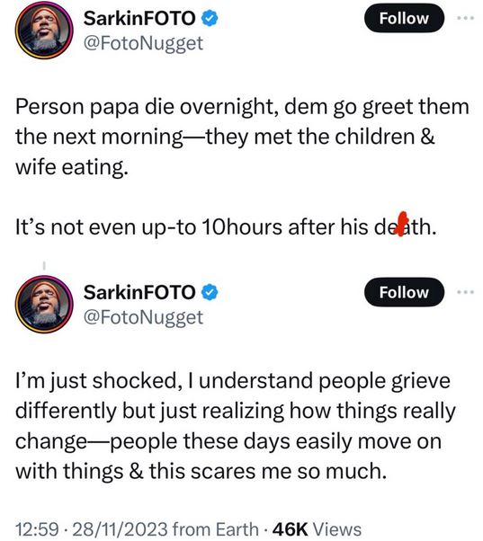 A Nigerian man has taken to 'X' to express shock after sympathizers met a woman and her children eating 10 hours after her husband passed on.