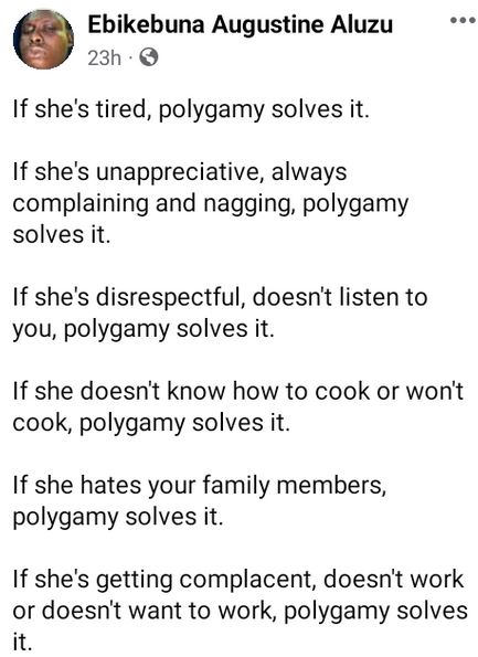 "If she's tired, polygamy solves it. If she's unappreciative, always complaining and nagging, polygamy solves it," he wrote in a Facebook post on Tuesday.