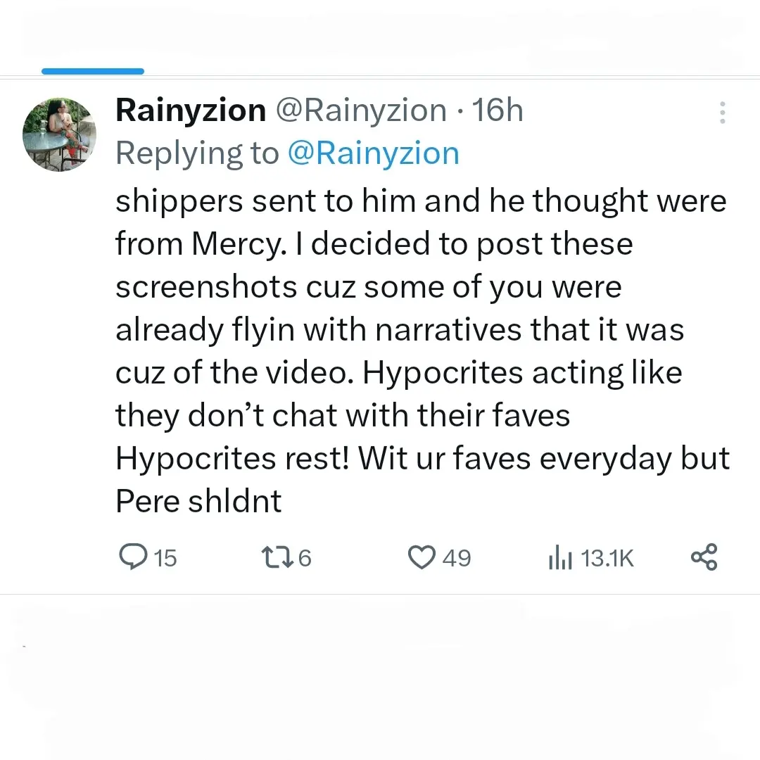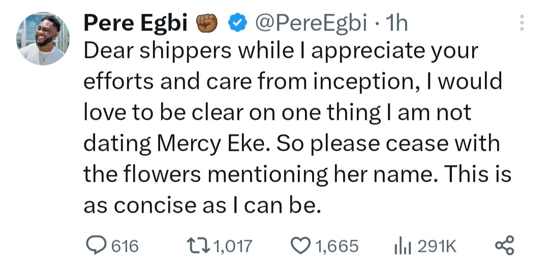 More details have emerged after Pere Egbi sent a disclaimer to “shippers” trying to force a relationship between him and Mercy.