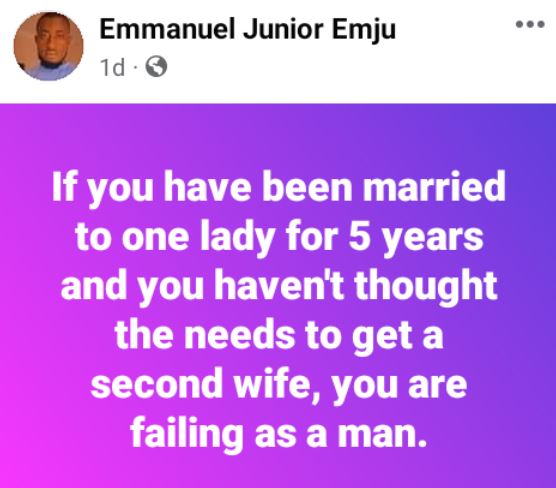A Nigerian polygamy advocate, Emmanuel Emju, has opined that any married man who has never thought of taking a second wife is a failure.