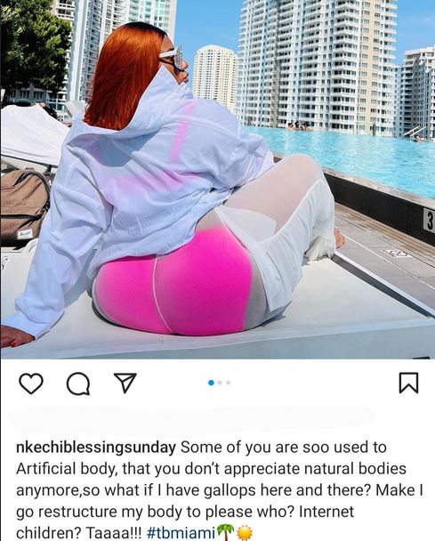 In the caption, she wrote: “Some of you are soo used to Artificial body, that you don’t appreciate natural bodies anymore, so what if I have gallops here and there? Make I go restructure my body to please who? Internet children? Taaaa!!!”