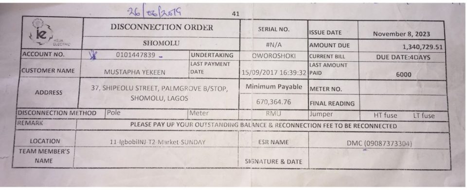 “On Wednesday, a co-tenant brought another disconnection notice given to him by Ikeja Electric officials with an outstanding payment of N1,340,739.51 with my name on it. He said they threatened to come to our shop to disconnect electricity from the whole building soon. I learnt the account is abandoned, but I am curious to know why my name is reflecting on it,” Mustapha added.