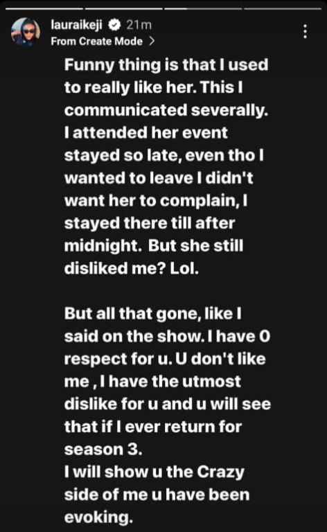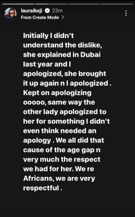 “Initially I didn’t understand the dislike, she explained in Dubai last year and I apologize, she brought it up again and I apologize, kept on apologizing oooo, same way the other lady apologized to her for something I didn’t even think needed an apology. We all did that cause of the age gap and very much the respect we had for her. We are Africans we are very respectful.