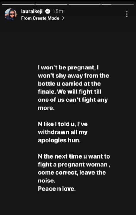 I wont be pregnant, I won’t shy away from the bottle you carried at the finale. We will fight till one of us can’t fight anymore.N like I told you I have withdrawn all my apologies hun. N next time you want to fight a pregnant woman come correct, leave the noise. Peace and love.”