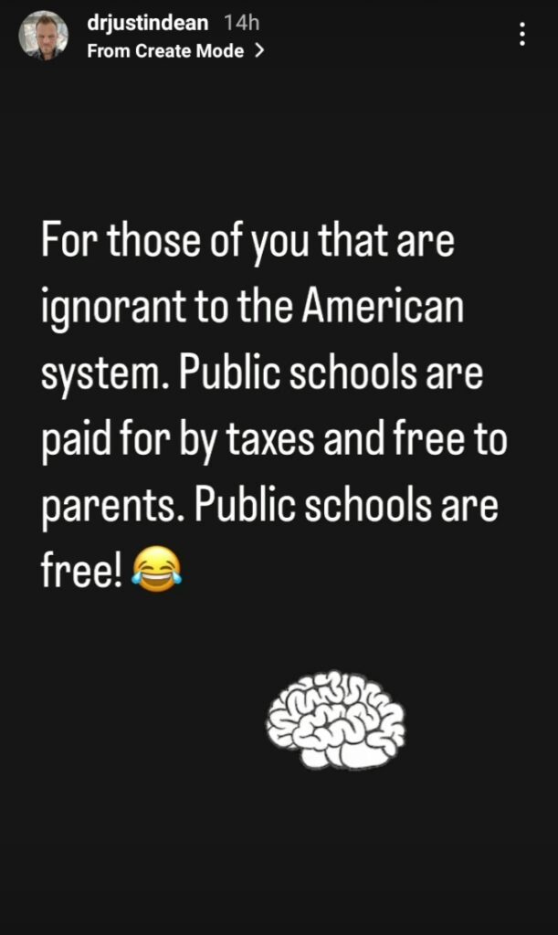 “For those of you that are ignorant to the American system. Public schools are paid for by taxes and free to parents. Public schools are free!!”