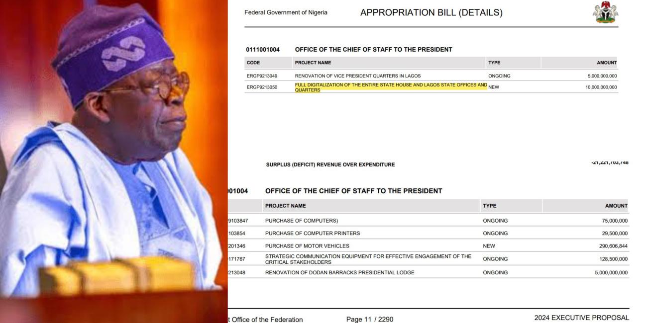 The Nigerian Government is planning to allocate a total of N10 billion for the digitalization of the State House and Lagos State offices in 2024, as revealed in the details of the 2024 budget proposal.