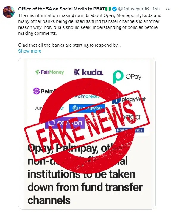 Dada Olusegun, the Special Assistant to President Bola Tinubu on social media has given clarifications following reports that the Central Bank of Nigeria (CBN) threatened to delist money transfer banks like Opay, Kuda, Moniepoints and others from transfer channel.