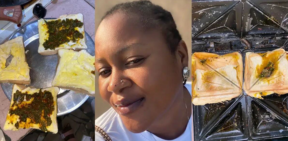 A Nigerian lady has taken to social media to showcase her culinary skills as she used vegetable soup to make toasted bread.