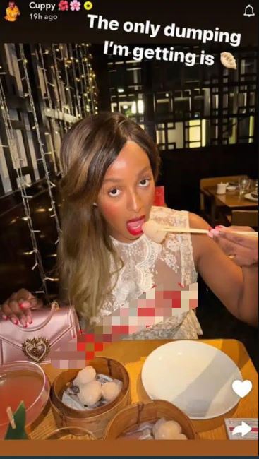 Reacting via her Snapchat, DJ Cuppy posted a photo of herself enjoying a dumpling at a restaurant and added that the only “dumping” she’s getting is from the dumpling.