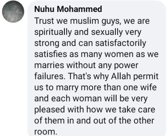 A Nigerian man, Nuhu Mohammed has said that Muslim guys are more spiritually and s3xually strong hence the reason why Allah permitted them to marry more than one wife.