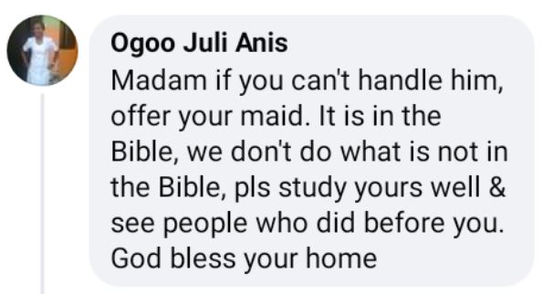 Reacting to the post, Ogoo wrote: "Madam, if you can't handle him, offer your maid. It's in the Bible. Pls study yours well and see people who did before you. God bless your home,” she wrote.