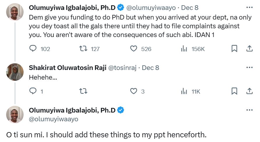 “Dem give you funding to do PhD but when you arrived at your dept, na only you dey toast all the gals there until they had to file complaints against you. You aren't aware of the consequences of such abi. IDAN 1. O ti sun mi. I should add these things to my ppt henceforth.”