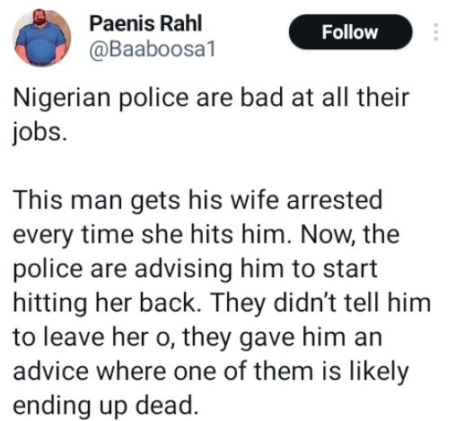 “Nigerian police are bad at all their jobs. This man gets his wife arrested every time she hits him. Now, the police are advising him to start hitting her back. They didn’t tell him to leave her o, they gave him an advice where one of them is likely ending up dead,” he wrote on Sunday, December 10.