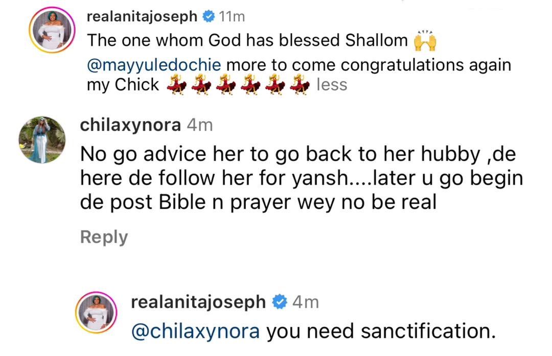 Anita Joseph Replies Troll Who Tackled Her For Not Advising May To Go Back To Her Hubby, Yul Edochie
