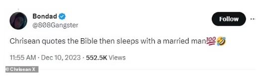 He also retweeted a follower who said of Chrisean, 'Chrisean quotes the Bible then sleeps with a married man.'