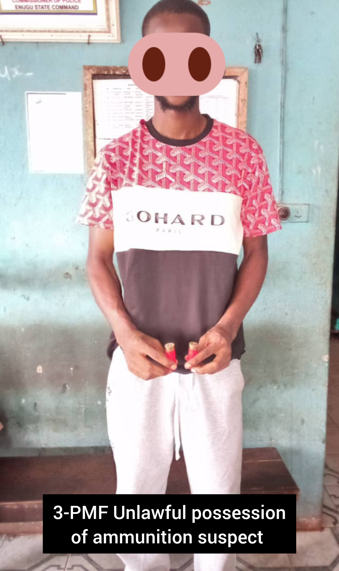 In a related development, Police Operatives of Number 3 Police Mobile Force (PMF) Enugu, while on routine stop and search duty along the Enugu/Onitsha expressway, on 06/12/2023 at about 11.50 a.m., intercepted and arrested one Alozie Clinton Chidubem aged 22, and found in his unlawful possession two live cartridges.''