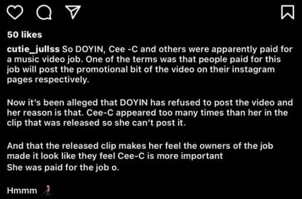 The blogger, Cutie Juls alleged that Doyin has refused to post the music video of Mc Galaxy she featured in together with colleague Ceec.