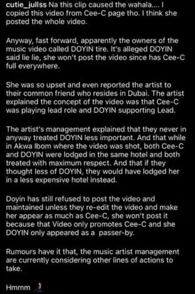 Former Big Brother Naija housemate, Doyin David, responded to a post by an Instagram blogger alleging that the reality star is having a feud with CeeC over a music video they both appeared in.
