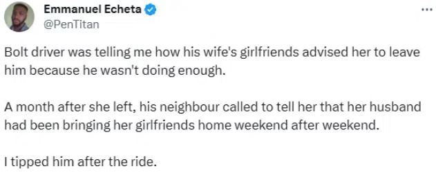 Emmanuel tweeted: “Bolt driver was telling me how his wife’s girlfriends advised her to leave him because he wasn’t doing enough.