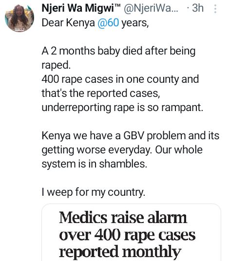 “Dear Kenya @60 years. A 2 months baby died after being r*ped. 400 r*pe cases in one county and that's the reported cases, underreporting r*pe is so rampant. Kenya we have a GBV problem and it's getting worse everyday. Our whole system is in shambles. I weep for my country,” she wrote.