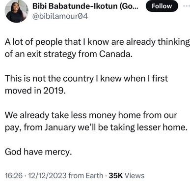 A Canada-based Nigerian lady, Bibi Babatunde has disclosed that a lot of Nigerians who relocated to the country are already thinking of an exit strategy from the North American country.