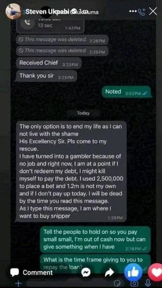 His last chat has now been released to shed light on his reasoning. In the chat, he is seen telling a certain “Excellency” that he became a gambler because he had no job or money. He added that of the N2.5m he used to make the bet, N1.2m was not his.