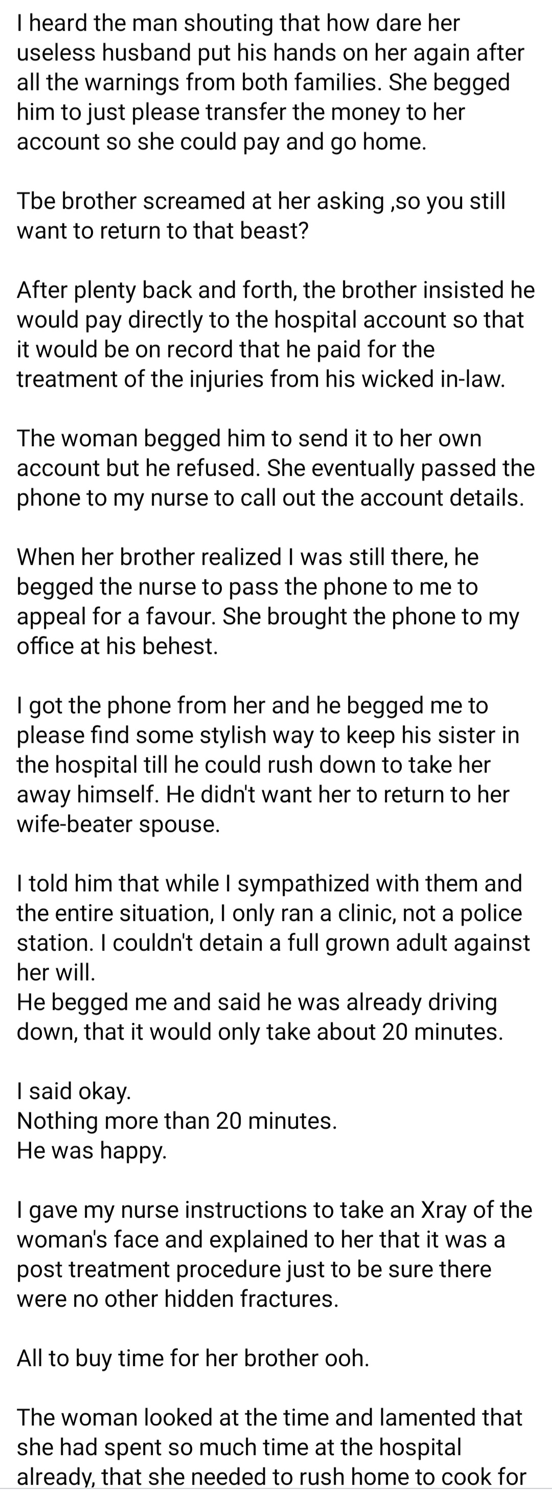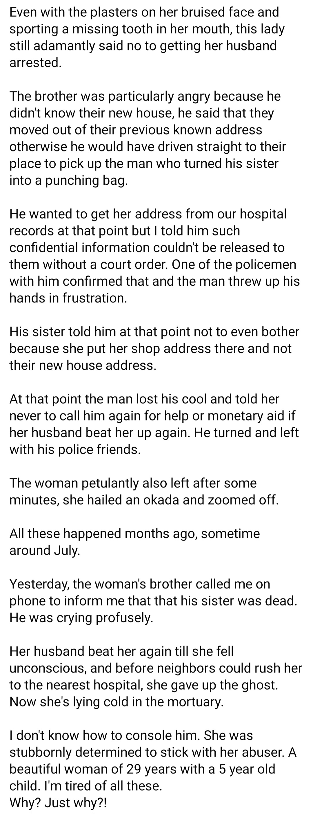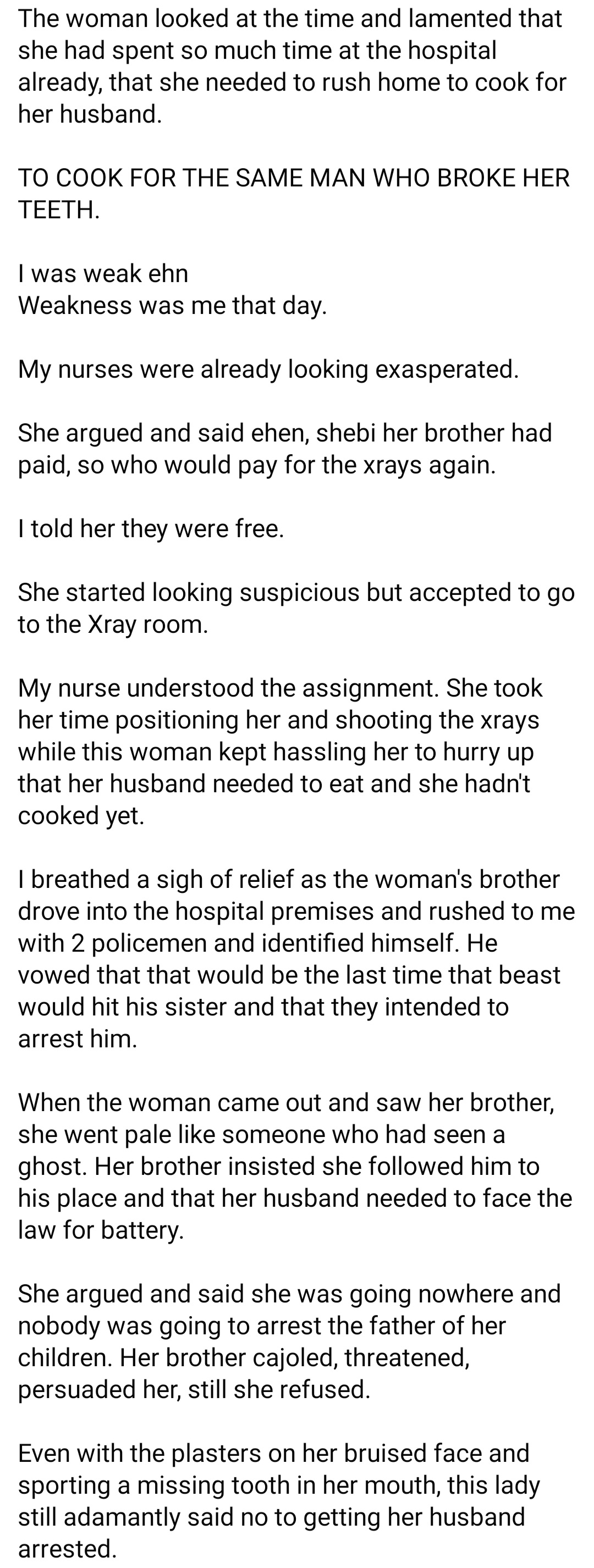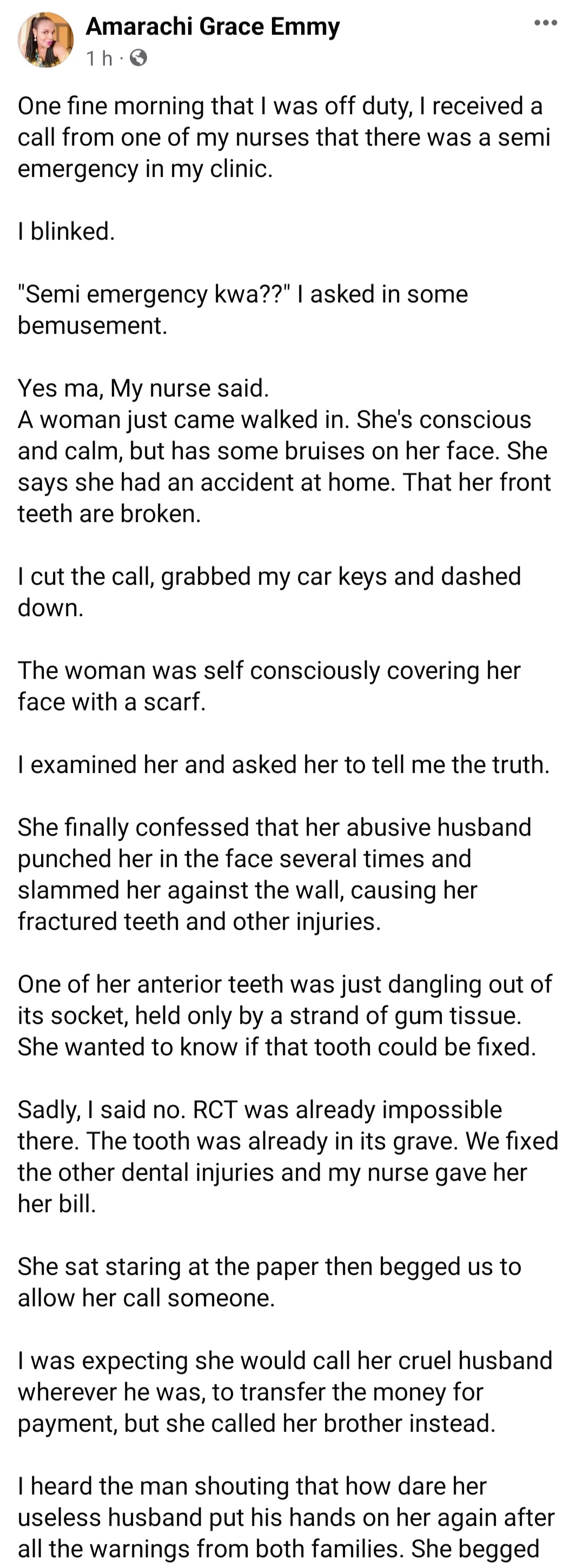 A dental surgeon has recounted her sad experience with a female patient who was married to an abusive husband.