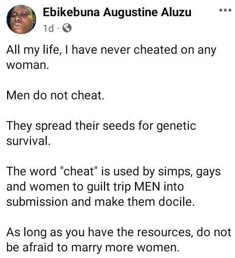 "All my life, I have never cheated on any woman. Men do not cheat. They spread their seeds for genetic survival. The word "cheat" is used by simps, gays and women to guilt trip MEN into submission and make them docile. As long as you have the resources, do not be afraid to marry more women."