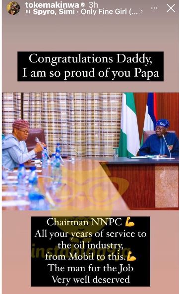 Popular media personality and actress, Toke Makinwa has taken to social media to rejoice following the appointment of her father, Chief Pius Akinyelure as chairman of the Nigerian National Petroleum Corporation (NNPC).